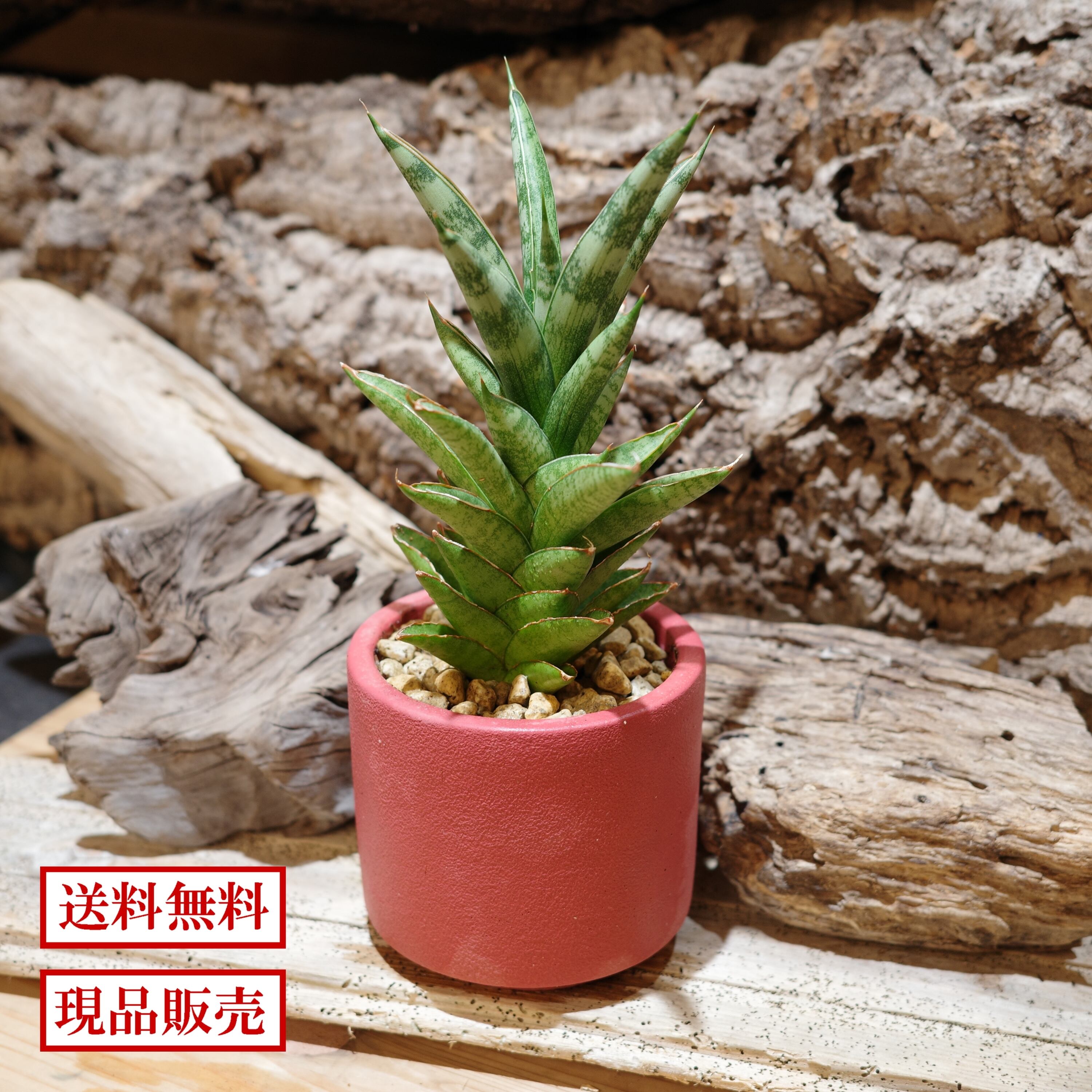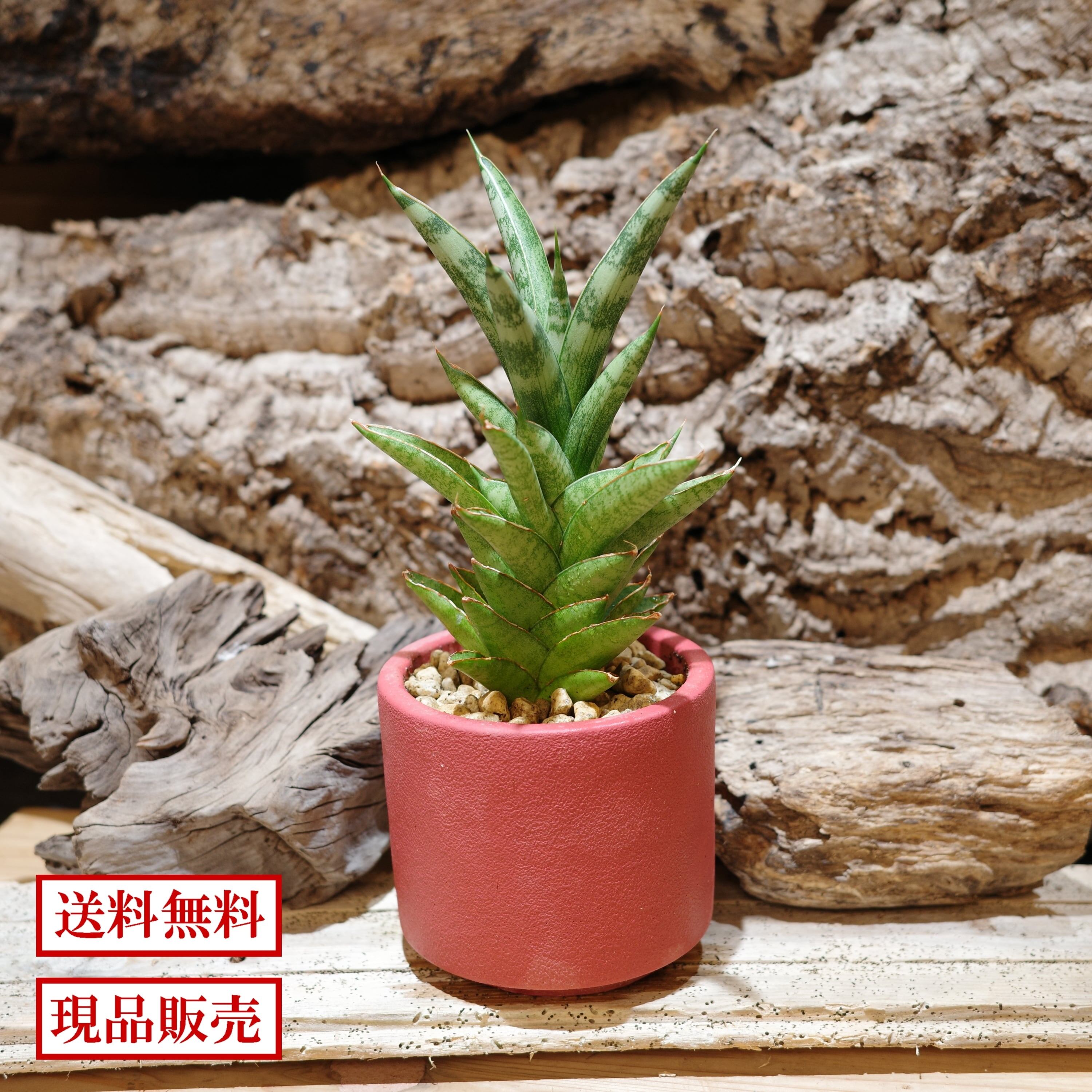 タワー型のシャープなシルエットが魅力のレア系サンセベリア・シューターを紅色の鉢にアレンジしました。